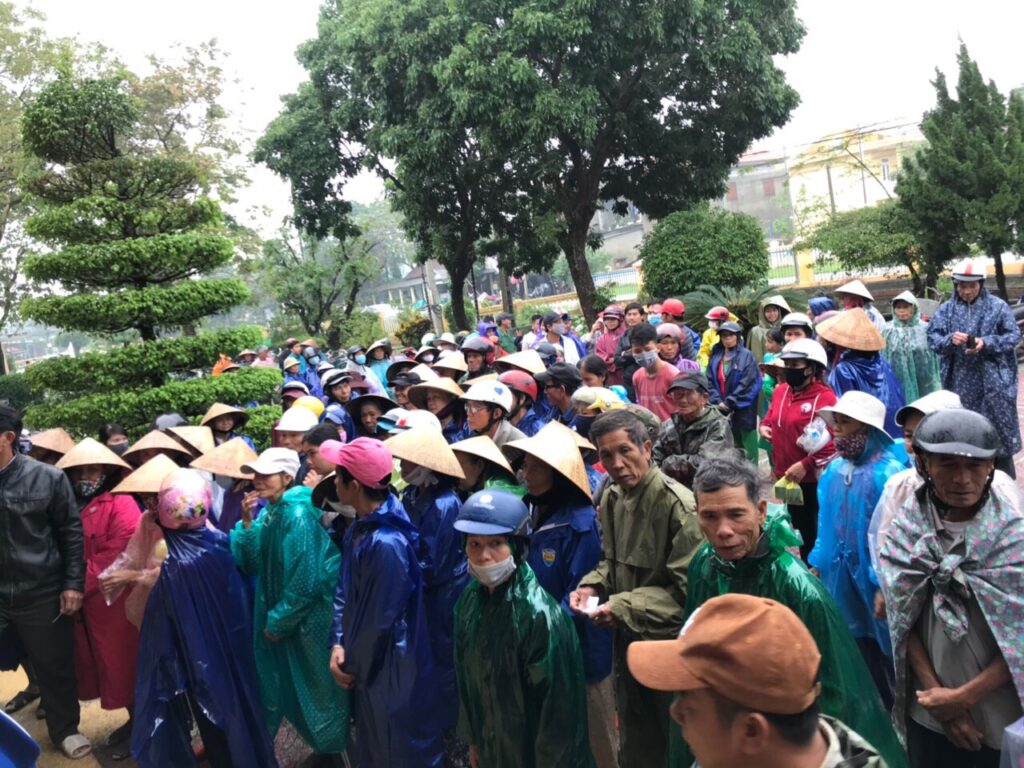 Hình ảnh người dân đang xếp hàng nhận phần quà cứu trợ
